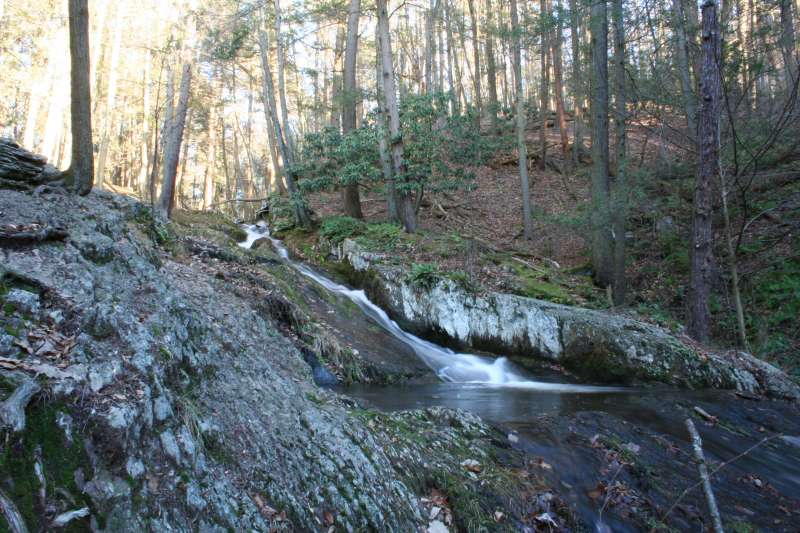 Here, also, are a picnic area and plenty of trails to follow. Tillman Brook starts on the western slope of Kittatinny Ridge and flows down to the Flatbrook. The water flows across High Falls formation of green and red sandstone which create the ravine. The trails follow the stream down steep slopes blanketed with hemlocks and moss covered rocks. A long series of falls and cascades create a wild and scenic view. Many people visit the ravine in summer since it remains cooler here under the hemlocks than other areas of the forest. Early spring is also a great time to visit. You may have the entire place to yourself.