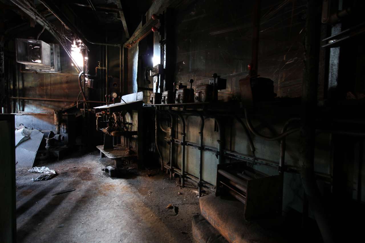Control room for machines operating in what looks to be the slag run off area.