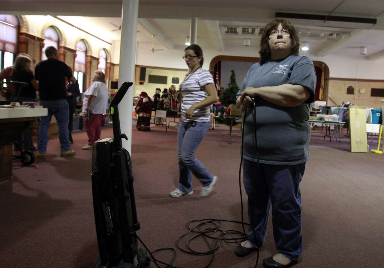 Susan Bunting (right), an X-Ray technician at Hagedorn Psychiatric Hospital for 12 years finishes vacuuming the auditorium rug as she an other staff members prepare for the June 16 closing of the site.