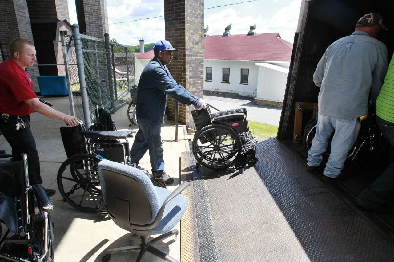 Employees from Hagedorn Psychiatric Hospital and the North Jersey Development Center load wheelchairs from Hagedorn into a back of a truck.