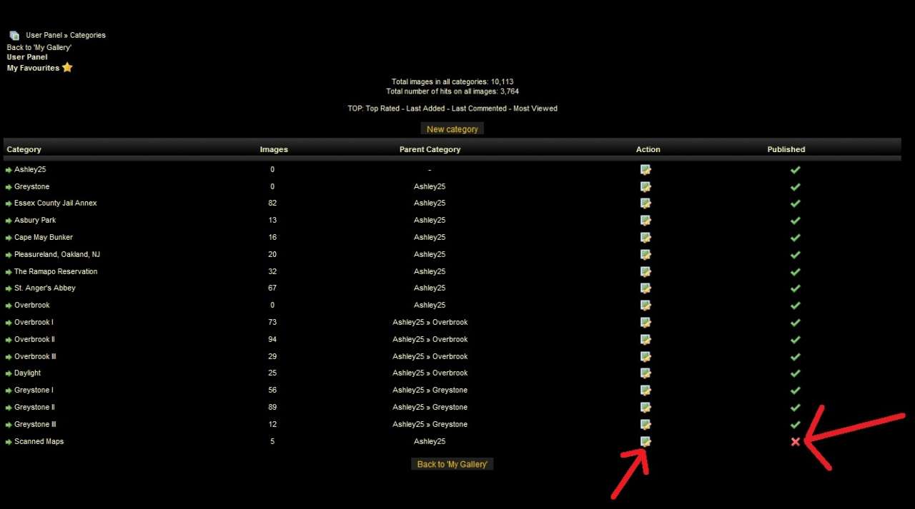 The red "X" on the right means Your album isn't published. All albums are this way so Members who don't upload anything dont clutter the gallery with empty albums. Click the "Edit" button that the red arrow is pointing to on the left.