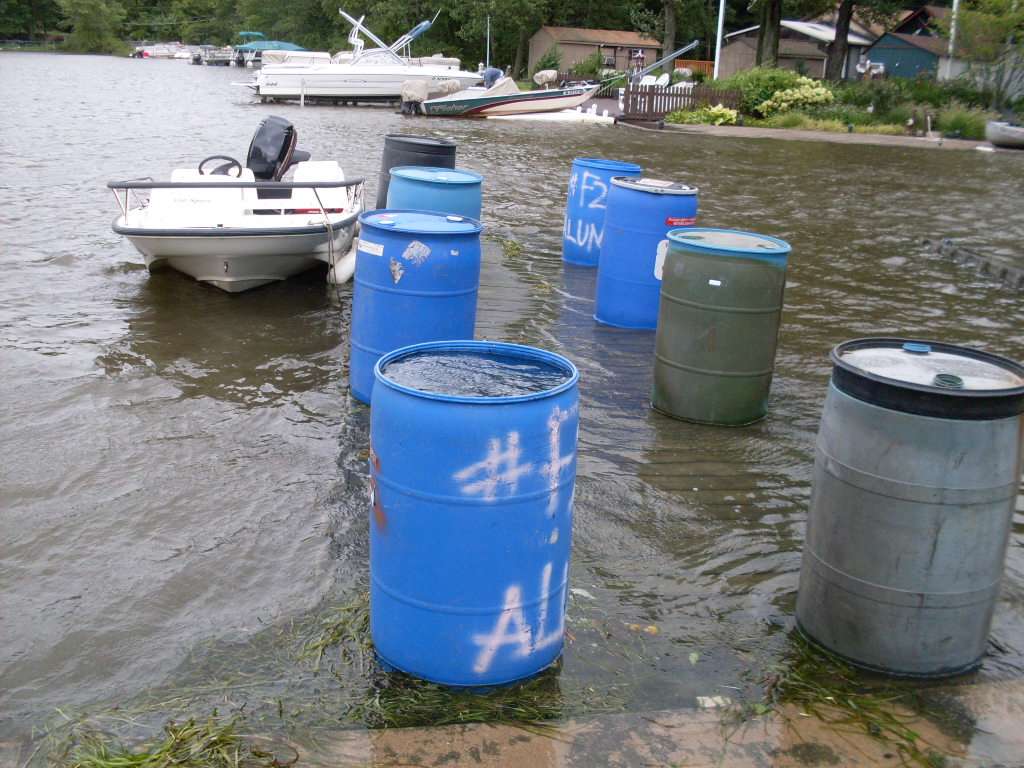 Neighbors dock almost completely underwater. Barrels are full of water for weight. Otherwise the dock will float away.